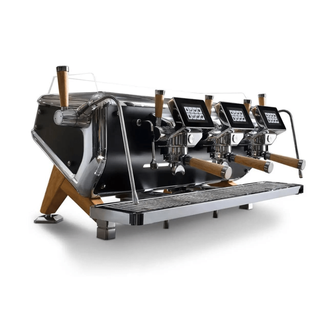 - 5” wyświetlacze dotykowe dedykowane każdej grupie, które informują baristę o czasie parzenia, temperaturze, wykres przepływu i ciśnienia względem czasu.